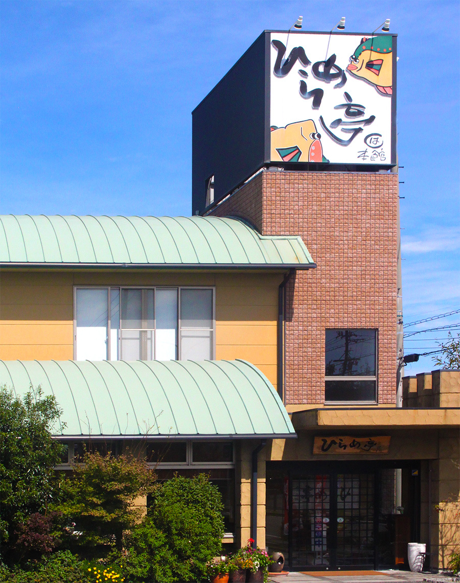 上ゲ駅を出て線路を渡り、267号線を直進。「武豊平井畑」の信号で右折するとひらめ亭が見えます。